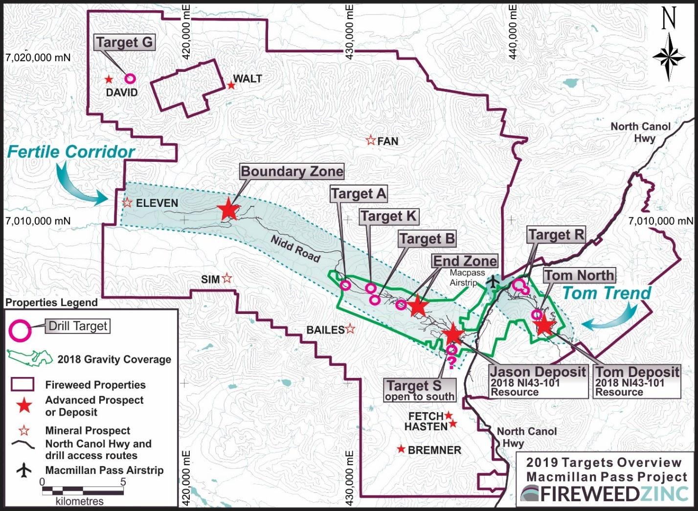 About Fireweed Zinc Ltd. (TSXV: FWZ): Fireweed Zinc is a public mineral exploration company focused on zinc and managed by a veteran team of mining industry professionals. The Company is advancing its district-scale 544 km2 Macmillan Pass Project in Yukon, Canada, which is host to the 100% owned Tom and Jason zinc-lead-silver deposits with current Mineral Resources and a PEA economic study (see Fireweed news releases dated January 10, 2018, and May 23, 2018, respectively, and reports filed on www.sedar.com for details) as well as the Tom North Zone, Boundary Zone and End Zone which have significant zinc-lead-silver mineralization drilled but not yet classified as mineral resources. The project also includes option agreements on large blocks of adjacent claims (MAC, MC, MP, Jerry, BR and NS) which cover exploration targets in the district where previous and recent work identified zinc, lead and silver prospects, and geophysical and geochemical anomalies in prospective host geology.