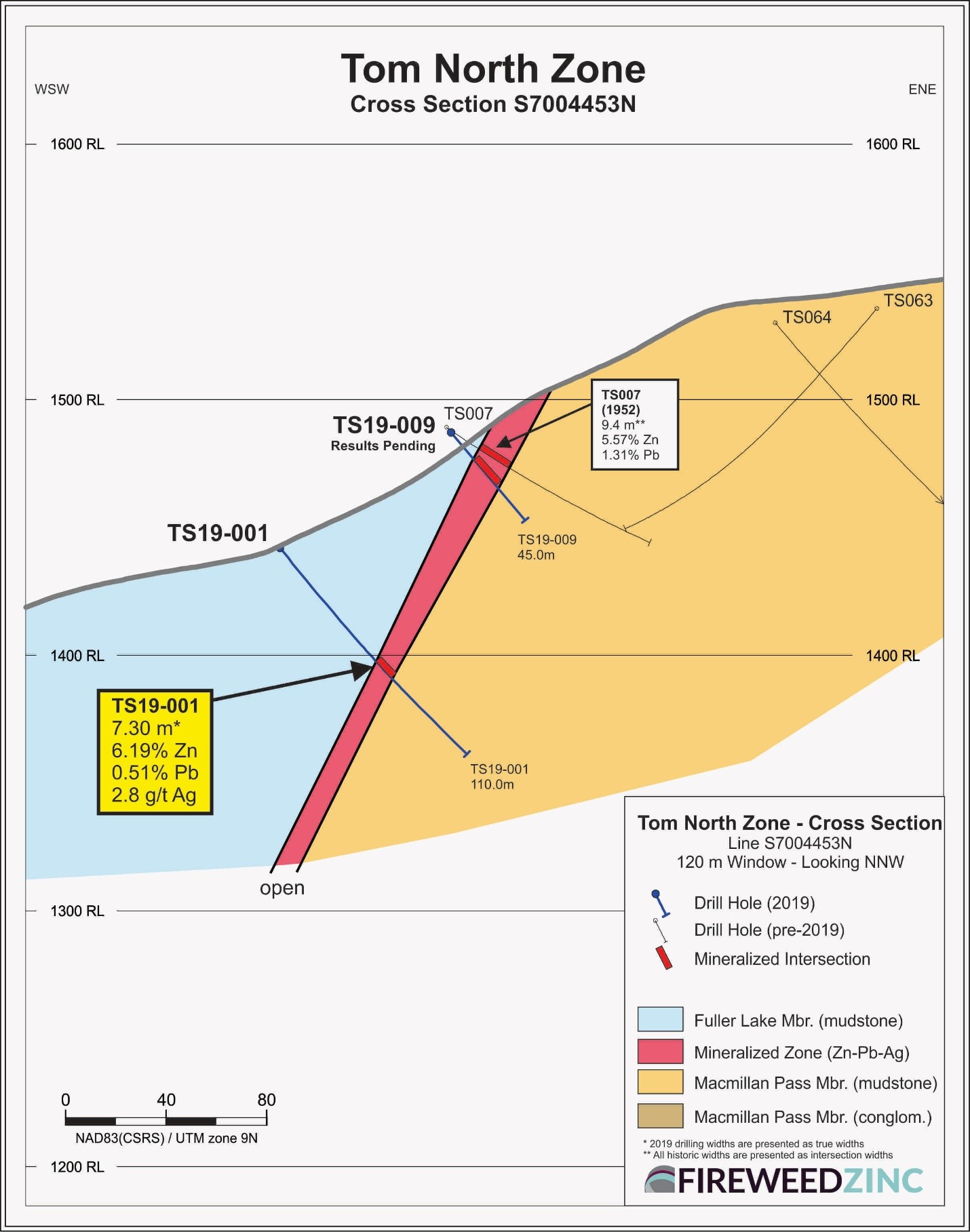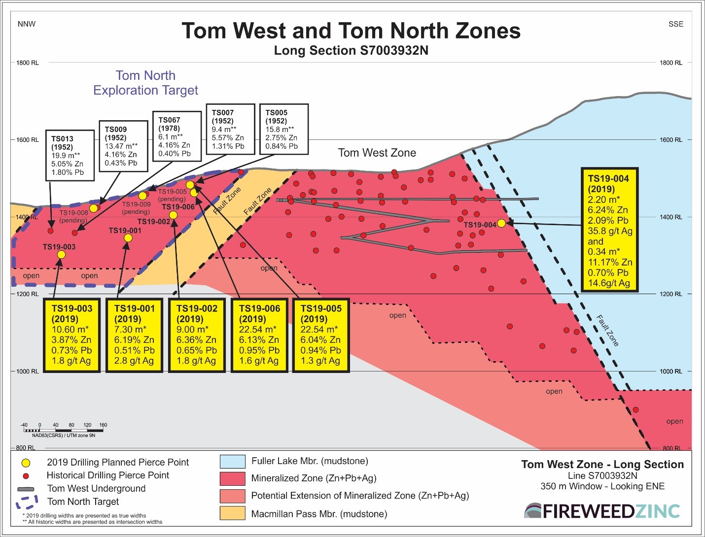 Brandon Macdonald, CEO, stated, “We are pleased with the results from the first 2019 drill assays. So far Tom North is showing potential open-pit results and it is noteworthy that holes TS19-005 and TS19-006 reported much higher grades over wider intervals than the 1952 hole they twinned due to better recoveries using modern drilling techniques. With these positive first drill assays now in, we look forward to release of drill results from other zones tested this summer to expand on our current resources, which are already among the largest undeveloped zinc resources in the world, as well as the field program of geophysics, geochemistry and mapping still ongoing.”