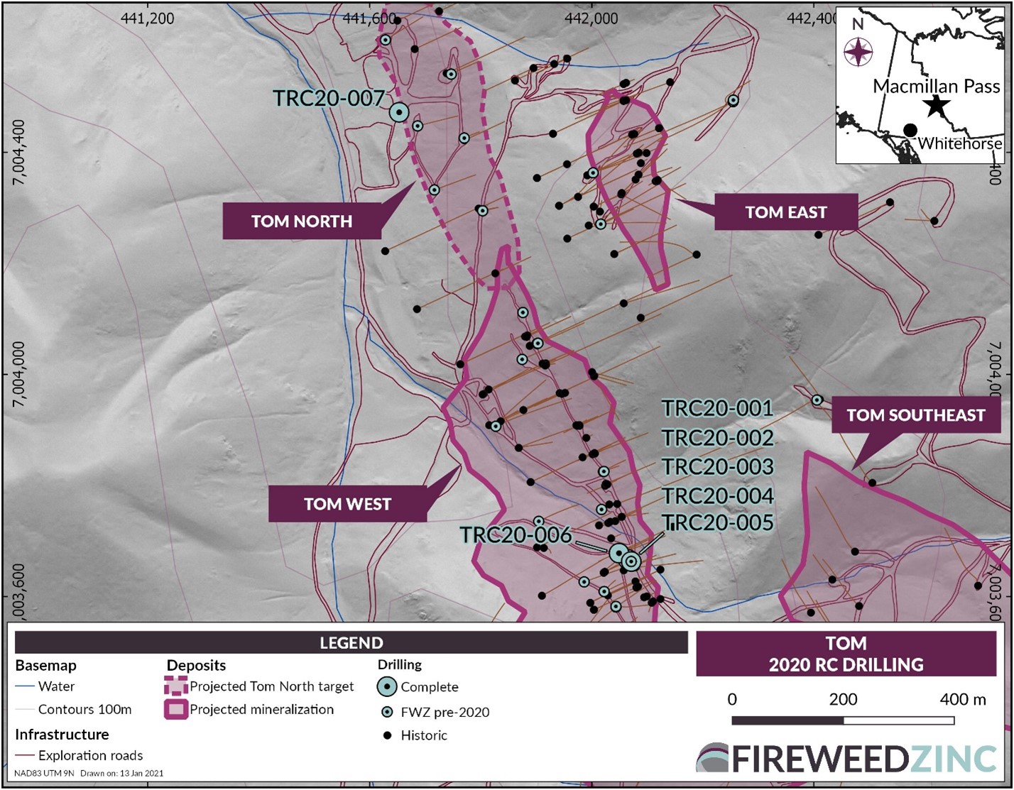 The 2020 RC infill drilling at Tom West was located in the high-grade, feeder-proximal part of the deposit where the current Mineral Resource is supported by small-diameter historic AX (30.1 mm diameter) or EX (20.6 mm diameter) diamond drill core (see Map 2 and Fireweed news release dated January 10, 2018). Hole TRC20-002 was an RC twin of an historic EX diamond drill hole, TS020. Zinc grades are very similar but lead and silver grades are significantly higher in TRC20-002 compared to historic hole TS020. Elsewhere at Tom West and at Tom North, similar patterns have been observed where modern drilling methods show significantly higher grades and thicknesses than nearby historic small-diameter core diamond holes due to better recoveries with modern drilling methods (see Fireweed news releases dated October 10th, 2018 and August 20th, 2019). Other successful 2020 Tom West infill RC holes intersected consistent high zinc, lead and silver grades shown in Table 1.