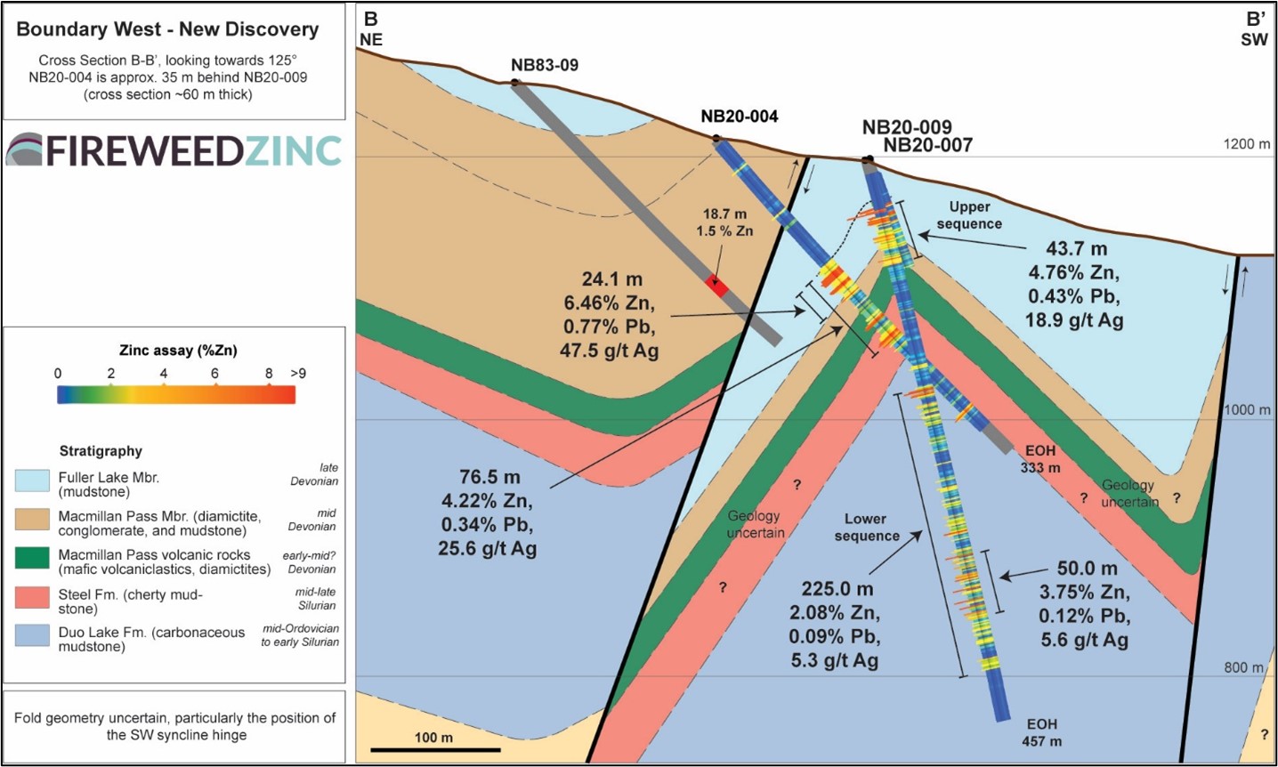Brandon Macdonald, CEO, stated “These first few holes into the new Boundary West discovery have shown the near-surface upper sequence to have significant widths and grade, not just in the newly discovered massive sulphide zone, but also within the barite-hosted stratiform mineralization which in NB20-009 has shown grade potential rivalling the best of Tom & Jason. The lower sequence at Boundary West shows similar grades to parts of central Boundary Zone over a 225 m intersection and the discovery of mineralization in these older rocks hugely expands the exploration space for new discoveries across the whole 940 km2 property. These initial intersections point to two distinct stratiform mineralized systems at Boundary West that are each underlain by significant thicknesses of vein mineralization. Boundary West remains open along strike and down dip, and may have continuity to central Boundary Zone to the east. This suggests a massive size potential and a staggering metal endowment.”