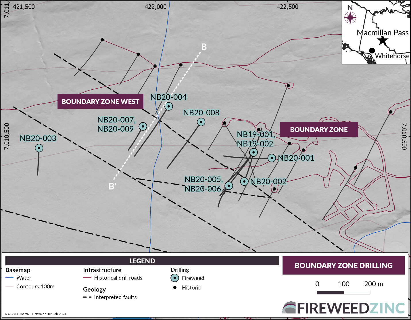 There is no Mineral Resource for Boundary Zone yet and the zone is not included in the current mineral resource estimate for the property (described in Fireweed news release dated January 10, 2018). Boundary Zone has potential to be mined in an open pit with a low strip ratio and to be upgraded through low cost, pre-concentration ore sorting processes (see Fireweed news release dated July 31, 2019). Recent drill results at Boundary Zone along with Tom North Zone and End Zone (see Fireweed news releases dated August 20th and September 10th, 2019; November 15th and 29th, 2018; January 26th, 2021) represent potential for expansion of the large current mineral resources on the property and improvement of Macmillan Pass project economics described in the current Preliminary Economic Assessment (PEA) (see Fireweed news release dated May 23rd, 2018).