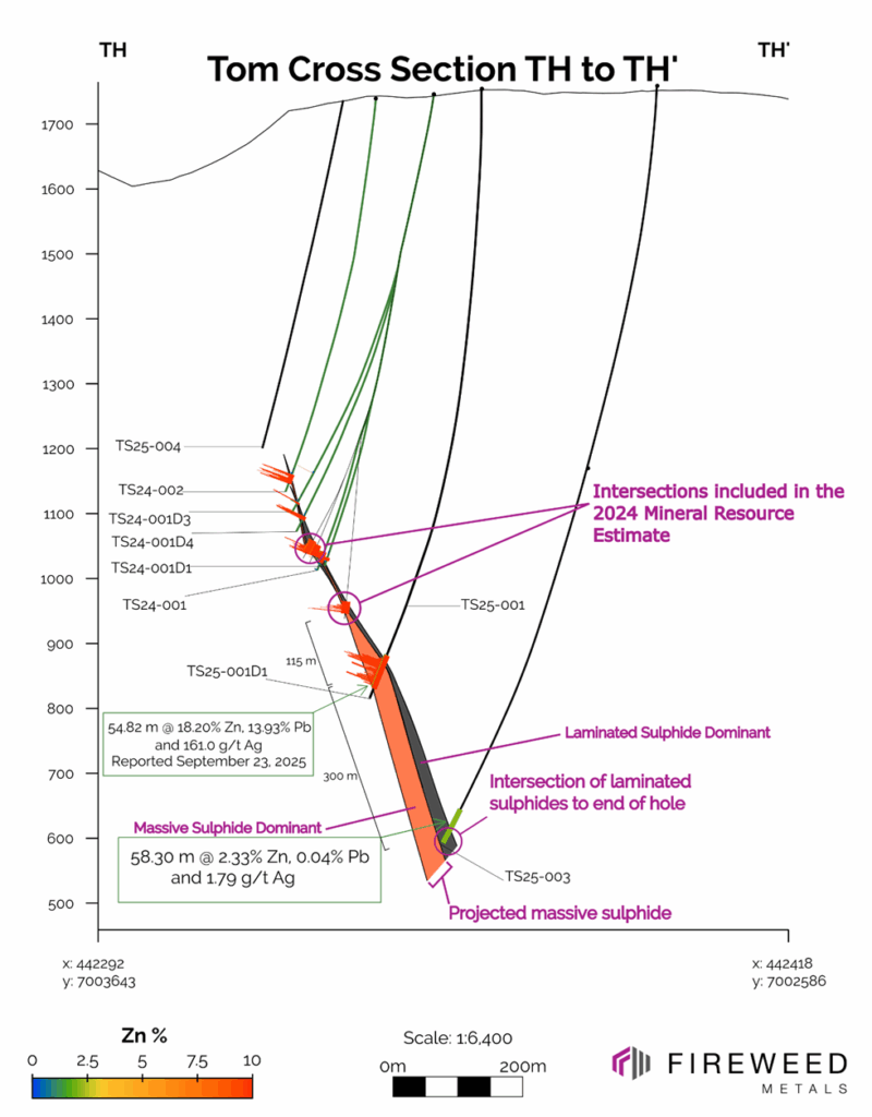 Fireweed’s VP Exploration, Dr. Jack Milton commented, “In 2025 we drilled one of our best ever step out holes at Tom in terms of grade and thickness, TS25-001D1, which intersected a wide interval of very high grade material on the edge of the current Mineral Resource1 and is interpreted as within or adjacent to a feeder-zone. In hole TS25-003 we intersected a low-angle 50 m intersection of intermittent black facies laminated mineralization within which we have paused drilling. This facies is the rock type that we see at Tom South overlying the feeder-proximal massive sulphide zone. After finishing off TS25-003, our 2026 drill program will leverage the success of the 2025 program and will use geological indicators to vector toward the feeder zone and test the down-dip extent of Tom South which remains open and where we see the potential for significant scale and grade.”