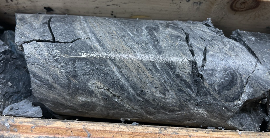 Photo 1: Selected interval of Black Facies mineralization in TS25-003 laminated sphalerite, barite, and mudstone