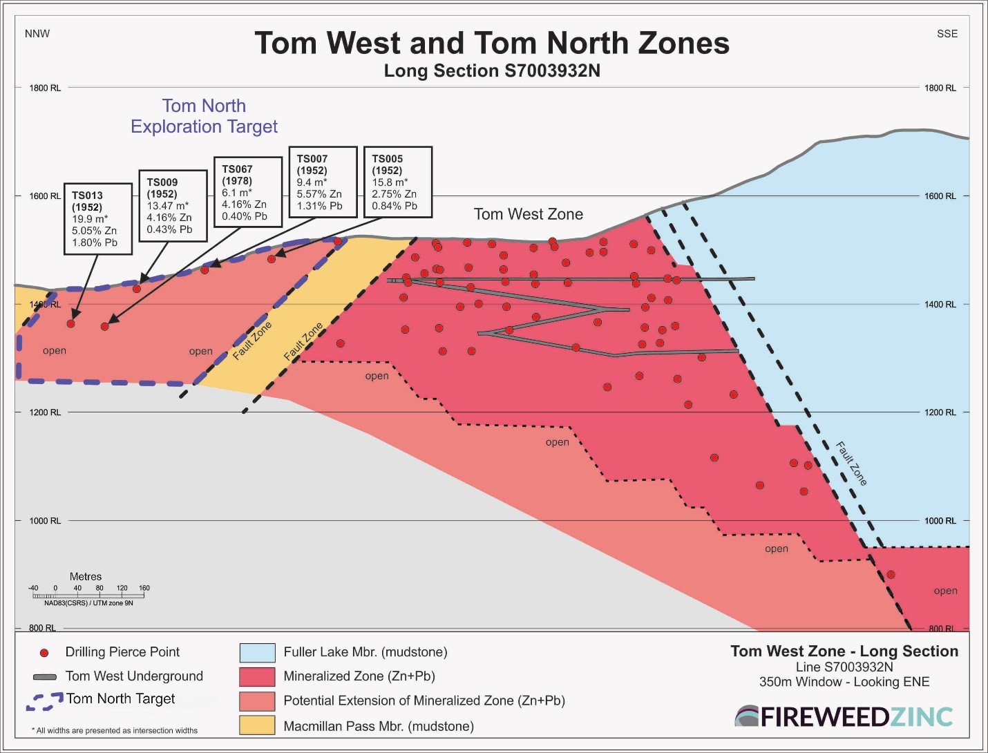 The Tom North target has been traced in sparse historic drill holes and trenches over a strike length of 600 m and only to shallow depths of about 50 m. Fireweed plans to drill the continuation of Tom North to depth to test its potential for mineralization amenable to open-pit mining and to test for thicker mineralization that is similar to the adjacent Tom West Zone1.