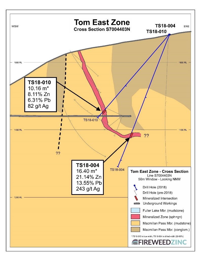 Tom East is one of the highest grade zones on the property. In 2018, drilling extended the zone to depth with the deepest hole intersecting 16.4 m grading 21.14% zinc, 13.55% lead and 243 g/t silver (Figure 5; see Fireweed news release dated September 20, 2018 for details). The zone remains open for expansion with plans to continue testing its depth extension by core drilling in 2019.