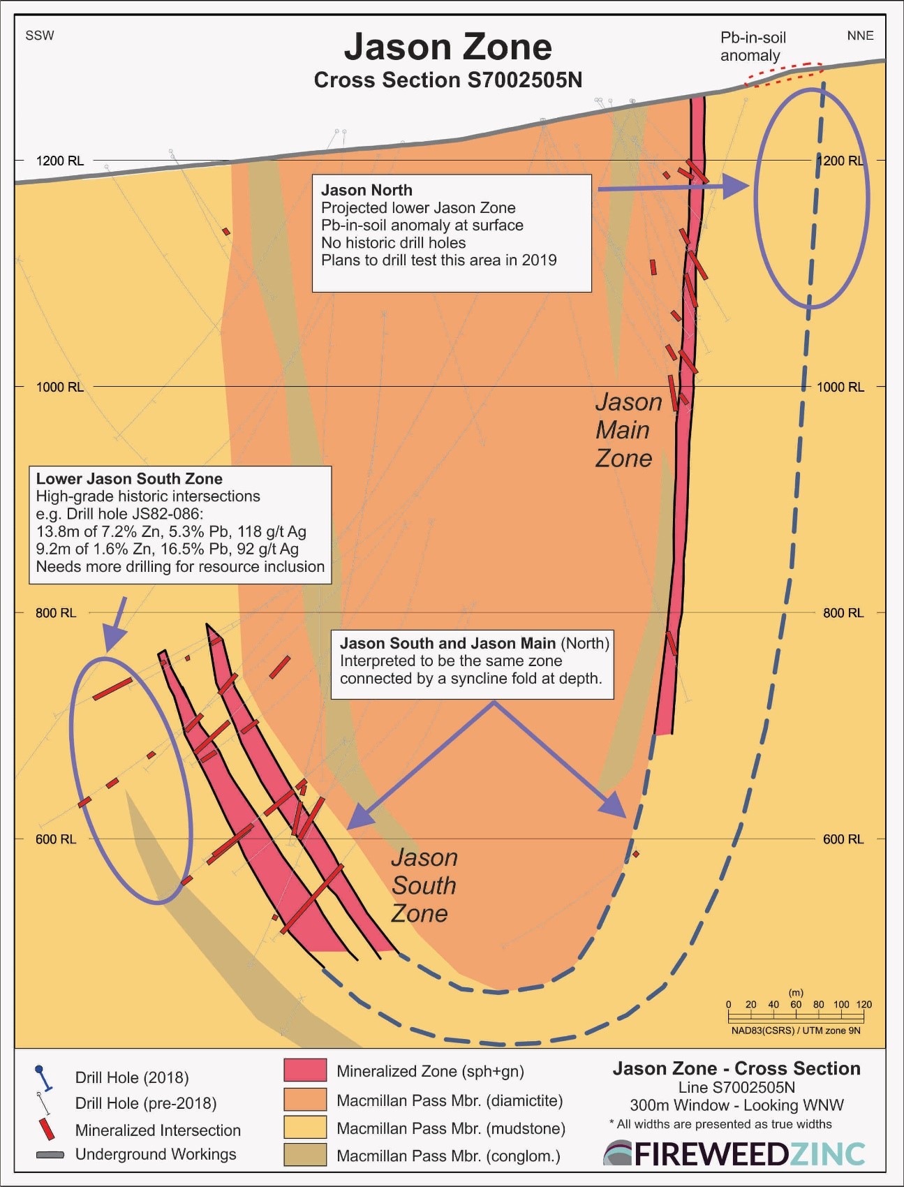 Jason North is a new untested drill target located immediately north of the Jason Main Deposit. It was defined through re-interpretation of historic data, and confirmed by soil sampling in 2018. The Jason Main and Jason South Zones are interpreted to be the same zone connected by a syncline fold at depth (Figure 6). A second zone with high grade historic drill intersections, Lower Jason South, occurs 20-30 m below the Jason South Zone and may similarly project around the syncline fold to a location north of Jason Main (Jason North). The Jason North area is marked by a strong lead-in-soil anomaly1, a strong basal overburden historic RC drill lead-in-soil anomaly, and a strong, double-peaked geophysical electromagnetic conductor consistent with a steeply-dipping conductive mineralized body. Despite its location close to the Jason Main Deposit, Jason North has never been drilled.