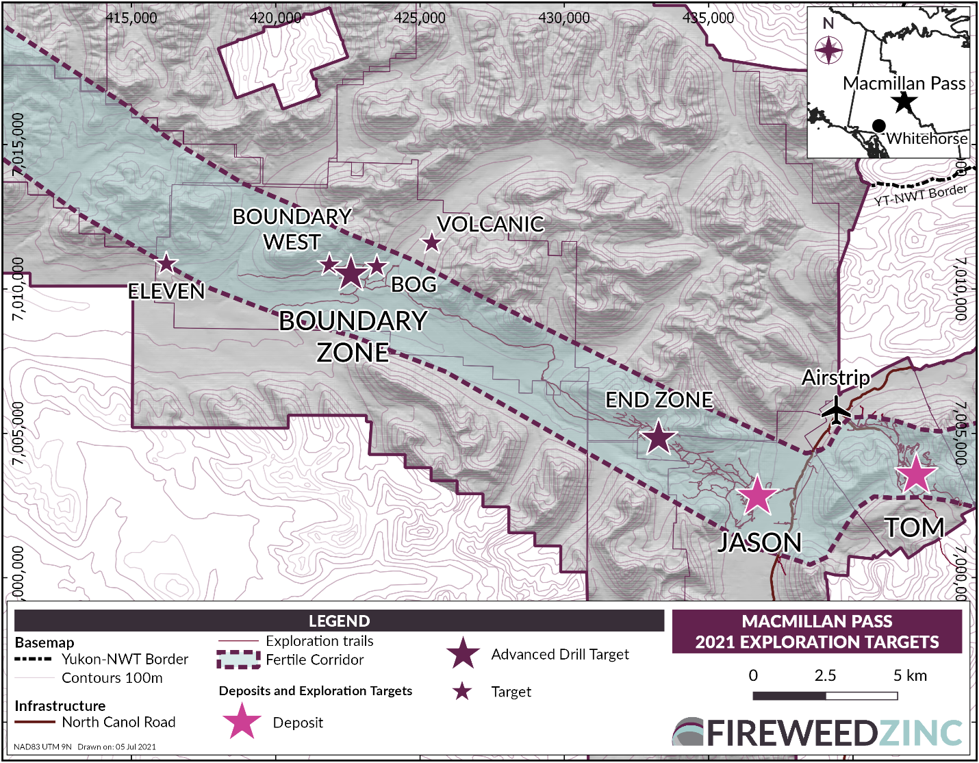 Fireweed Zinc is a public mineral exploration company focused on zinc-lead-silver and managed by a veteran team of mining industry professionals. The Company is advancing its district-scale 940 km2 Macmillan Pass Project in Yukon, Canada, which is host to the 100% owned Tom and Jason zinc-lead-silver deposits with current Mineral Resources and a PEA economic study (see Fireweed news releases dated January 10, 2018, and May 23, 2018, respectively, and reports filed on www.sedar.com for details) as well as the Boundary Zone, Tom North Zone and End Zone which have significant zinc-lead-silver mineralization drilled but not yet classified as mineral resources. The project also includes large blocks of adjacent claims (MAC, MC, MP, Jerry, BR, NS, Oro, Sol, Ben, and Stump) which cover exploration targets in the district where previous and recent work identified zinc, lead and silver prospects, and geophysical and geochemical anomalies in prospective host geology.