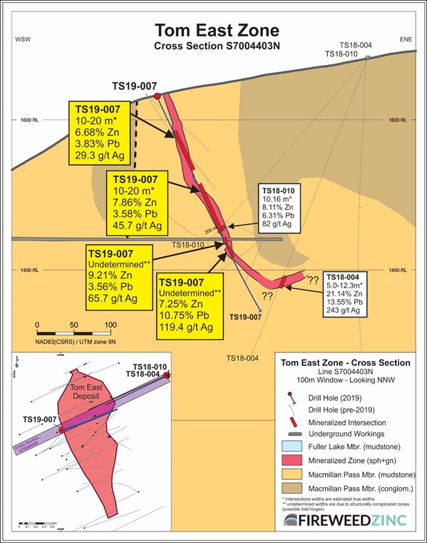 Tom East is the highest grade zone discovered on the property to date. In 2018, drilling extended the zone to depth with the deepest hole intersecting 16.4 m grading 21.14% Zinc, 13.55% Lead and 243 g/t Silver (Figure 5; see Fireweed news release dated September 20, 2018 for details). 2019 drill hole TS19-007 was planned to test the potential extension of the zone but the hole deviated from its planned course and drilled multiple down-dip intersections passing in and out of mineralization at very low angles to the zone. These high-grade infill results provide geological information that will inform geological modelling for resource expansion and exploration in the structurally complex Tom East zone (see Figure 5). The potential extension of the high-grade mineralization discovered in 2018 remains untested and Tom East is open at depth.