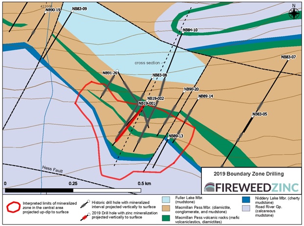 Known mineralization is spread over an area almost two kilometres long and 200 to 800 metres wide. Mineralization drilled in a central area is 350 metres long and has a true thickness of up to 250 metres with historic drilling grades averaging 2.0 ‑ 2.5% zinc1 that include multiple higher grade intervals closer to surface similar to the holes reported below from 2019 (see Figures 2 & 3 and Fireweed news release dated November 6, 2018). Higher grades near surface are favourable for potential open pit mining economics. The zone has been drilled up to 285 metres down dip and remains open to depth and along trend for further exploration.