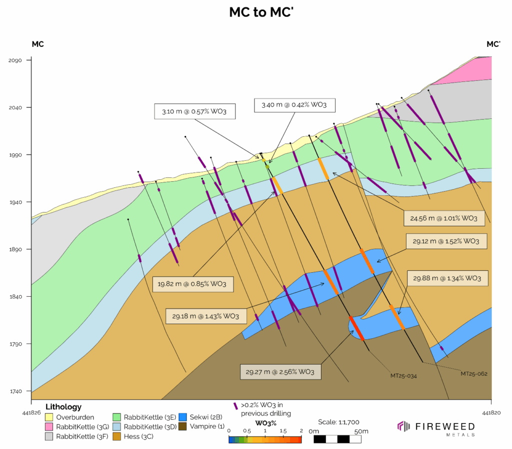 The 2025 drill program at Mactung comprised 11,117 m between a total of 66 holes. All assays have been received, and results for intervals that returned composite grades higher than 0.2% WO3 are reported here (See Tables 1 and 2, Cross Sections MB to MB’ and MC to MC’, Maps 1 and 2).