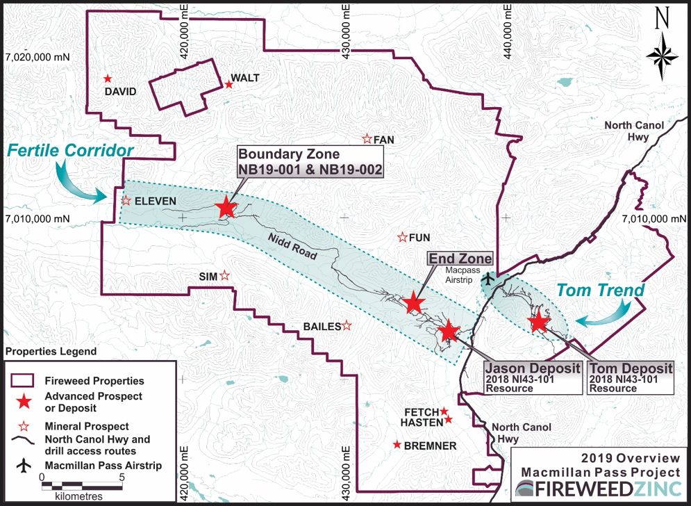 About Fireweed Zinc Ltd. (TSXV: FWZ): Fireweed Zinc is a public mineral exploration company focused on zinc and managed by a veteran team of mining industry professionals. The Company is advancing its district-scale 544 km2 Macmillan Pass Project in Yukon, Canada, which is host to the 100% owned Tom and Jason zinc-lead-silver deposits with current large Mineral Resources and a PEA economic study (see Fireweed news releases dated January 10, 2018, and May 23, 2018, respectively, and reports filed on www.sedar.com for details) as well as the Boundary Zone, Tom North Zone and End Zone which have significant zinc-lead-silver mineralization drilled but not yet classified as mineral resources. The project also includes option agreements on large blocks of adjacent claims (MAC, MC, MP, Jerry, BR and NS) which cover exploration targets in the district where previous and recent work identified zinc, lead and silver prospects, and geophysical and geochemical anomalies in prospective host geology.
